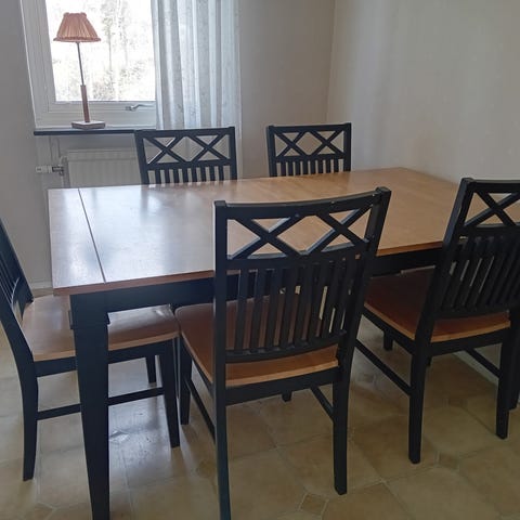 Äldre vitmålad matgrupp bestående av bord och fyra stolar, passar det lantliga köket. Stolarna är klädda med mörkbeige fläckfritt linnetyg. Det finns även fyra blå stolsdynor som kan skickas med. Utrymme finns för iläggsskiva men denna saknas tyvärr.