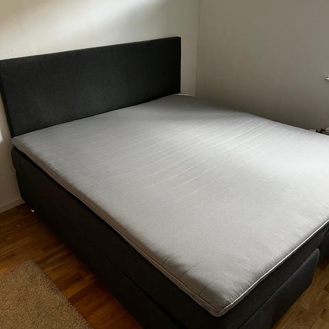 Mio säng i mörkgrått tyg. Sängen står på ben och har en enkel, rak design som passar i de flesta sovrum. Överkast eller bäddmadrass i mörk ton syns på bilden. Lämplig som säng för vuxen eller tonåring i ett sovrum eller gästrum.