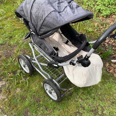 Stabil och bra kronan vagn med både ligg- och sittdel samt regnskydd. Däcken behöver pumpas och fixas till men annars funkar den bra. Perfekt som extravagn.