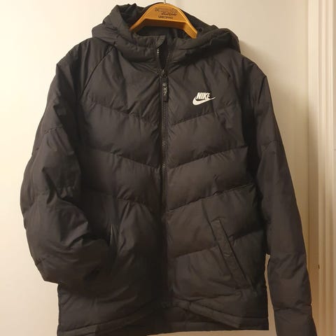 Nike jacka för pojke i storlek 152. Färgen är svart. Modellen är en vadderad ytterjacka med huva och hel dragkedja framtill. Passar som ytterplagg under kallare dagar.