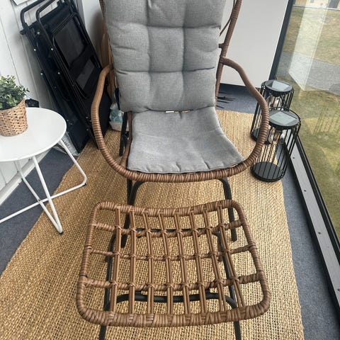 Fåtölj i rotting med högt ryggstöd och armstöd. Stolen har lösa, vadderade dynor i gröngrått mönstrat tyg på sits och rygg. Passar exempelvis i uterum, balkong eller vardagsrum som sittmöbel för avkoppling.