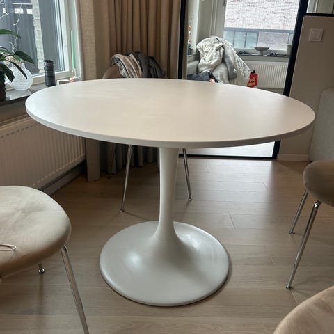Går att fälla ut förlängningskiva som är inbyggd och dold under bordet. Då blir bordet 198 cm