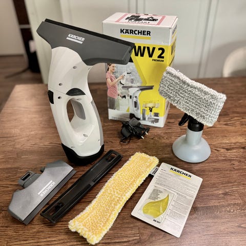 Kärcher SC 1 ångtvätt och fönstertvätt i gul färg. Setet består av en handhållen ångtvätt SC 1 med avtagbar slang och munstycke samt en batteridriven fönstertvätt med gummiskrapa. Tillbehör som mikrofiberöverdrag och sprayflaska medföljer enligt bild. Produkten är avsedd för rengöring av hårda ytor som kakel, fogar, köksytor och fönster. Ångtvätten använder enbart vatten för att lösa smuts, medan fönstertvätten suger upp smutsvatten från glasytor för att minska ränder och droppar.