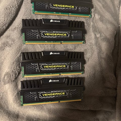 Corsair Vengeance RAM-minne DDR3 för stationär dator. Modulerna på bilderna är 4 GB styck med hastighet 1600 MHz (PC3-12800) och spänning 1,5 V. Färgkombination röd och svart med kylflänsar. Passar moderkort som stödjer DDR3 DIMM och 1600 MHz-minnen. Kontrollera kompatibilitet med moderkort och övriga komponenter innan användning.