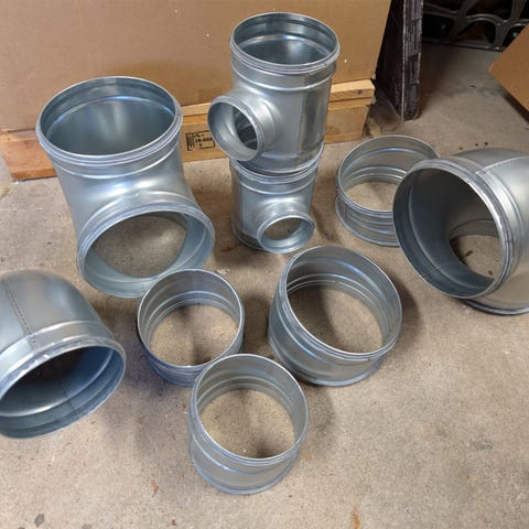 Ventilationsrör i plåt med tillhörande böjar och kopplingar. Passar för installation av ventilationssystem i bostad eller lokal. Flera raka rörsektioner samt vinklade delar för anslutning och dragning av kanaler. Materialet är metall/plåt, avsett för ventilationsändamål.