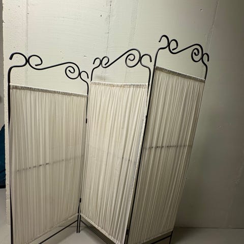 Rumsavdelare 3 vikbara paneler med svart metallram och dekorativa detaljer upptill. De ljusa tygpanelerna ger avskildhet. Passar för att dela av utrymmen eller som en inredningsdetalj.