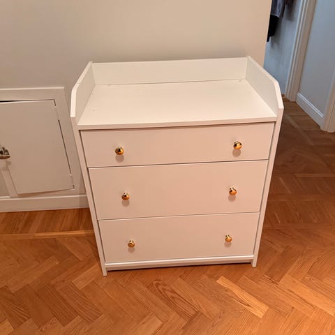 Vit byrå med handtag i gul metall.