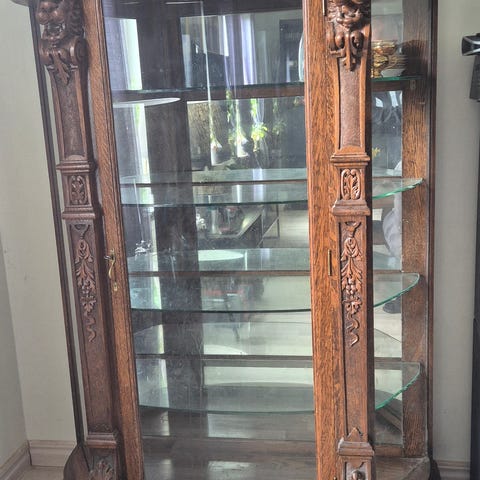 Italiensk vitrinskåp i trä med vitlaserad yta och dekorerade dörrar. Överdel med glasdörrar och flera glashyllor för förvaring och exponering av glas och prydnader. Underdel med skåp och lådor för dold förvaring. Bågad topp och klassiskt utformade detaljer. Passar i vardagsrum eller matsal som förvarings- och vitrinskåp.