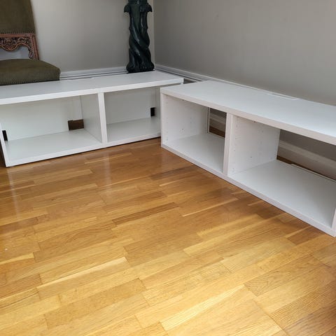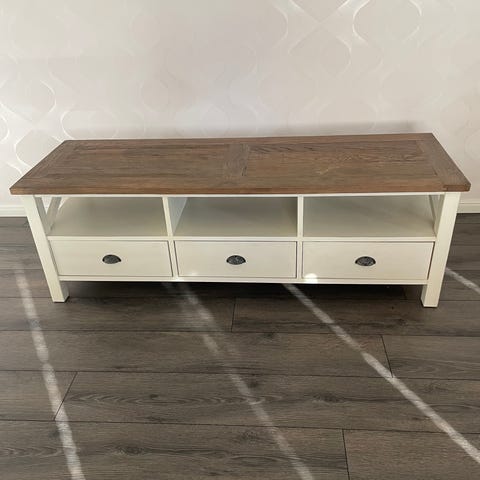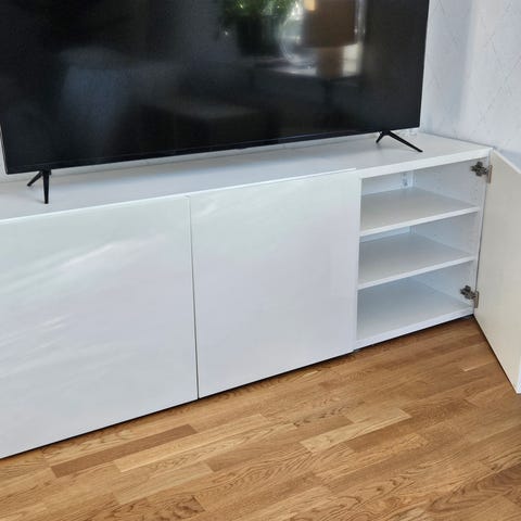 Vit Bestå Tv-bänk med glasskiva och 3 dörrar i frostat glas.