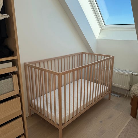 Spjälsäng i trä i naturfärg, Köpt ny från babymarkt.