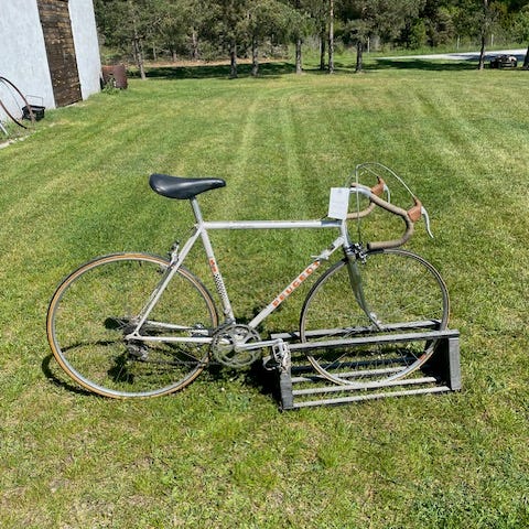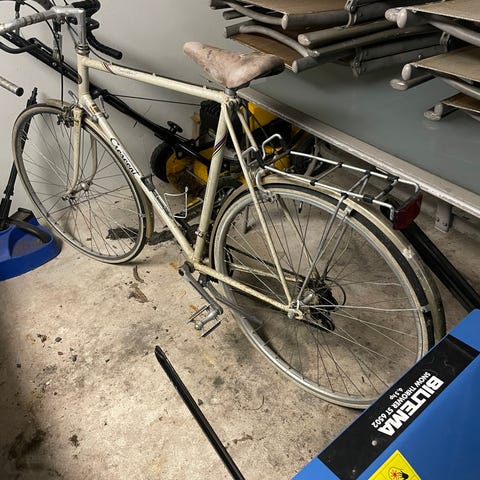 Perfekta vårprojektet om man har lite kärlek över att ge. Fin retro racercykel som fungerar. Dåligt med luft i framdäcket och punktering på bakdäcket. Shimano växlar styrda från ramen på gammaldags vis.