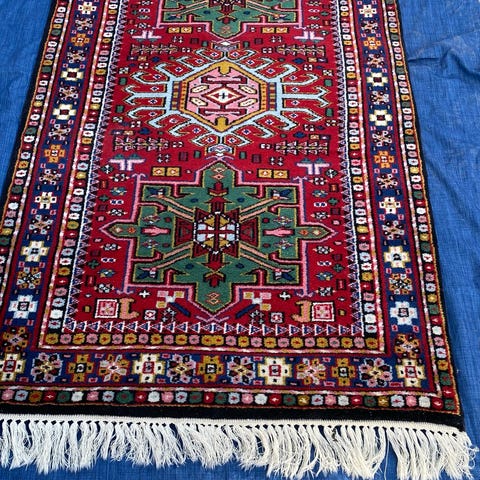 Matta med röd botten och flerfärgat, orientinspirerat mönster. Rektangulär form med central stjärnliknande medaljong och bårder längs kanterna. Passar exempelvis i vardagsrum, hall eller sovrum. Mattan är tjock och skön att gå på.