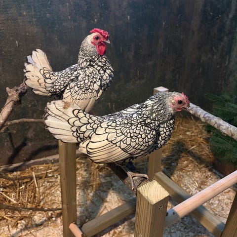 Fin amerikansk silkestupp kläckt i somras. Bor i en grupp med 6 hönor och en annan tupp, vilket funkar bra. Frisk och kry, fri från ohyra.