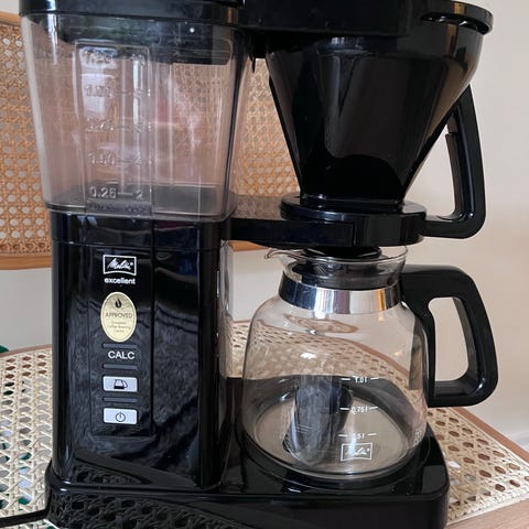 Melitta Aroma Signature kaffebryggare med glaskanna och svart plastdetaljer. Vattenbehållare med nivåmarkering på sidan. Bryggaren har droppstopp vid filterhållaren och värmeplatta under kannan. Elanslutning med stickkontakt upptill på vattenbehållaren. Passar för bryggning av filterkaffe i hem- eller kontorsmiljö.