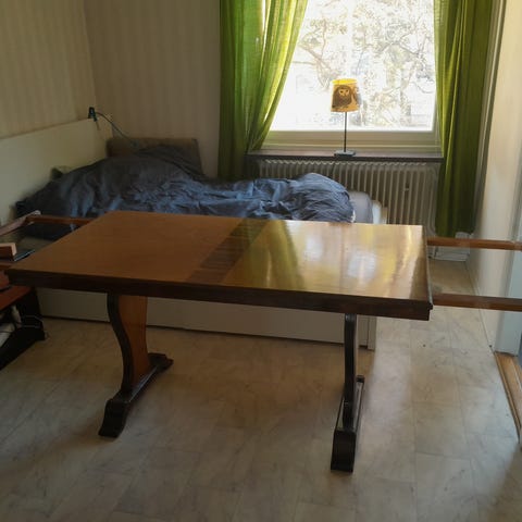 Så himla fint och bra bord som kan vilja ha lite kärlek. Vi har försökt släppa det i flera år och nu är det dags😭 det har gått i generationer men vet ej hur gammalt det är. fungerar utmärkt. Se bild för fläckar och dylikt. Går säkerligen med en starkare rengöring eller måla bara. Vill inte göra något som skulle kunna förstöra nu innan sälj. Bara att skriva om det dyker upp någon fråga.