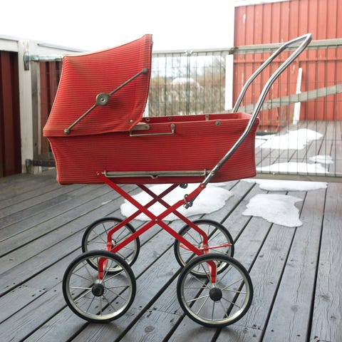 Dockvagn med en ram i rött och en sits i blått Manchester tyg med röda kanter. Vagnen har fyra hjul med vita fälgar och svarta däck. Den är hopfällbar för enkel förvaring.