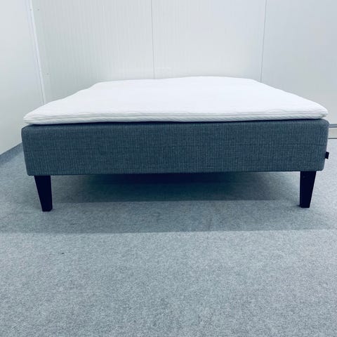 Jensen säng i grått tyg med metallben. Består av två bottnar som tillsammans bildar en dubbelsäng. Passar som stadig sänglösning i sovrum eller gästrum.