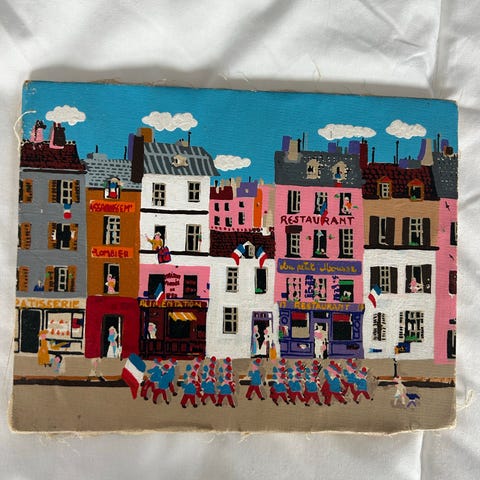 Två oljemålningar på duk av konstnär G Filip med lantliga landskapsmotiv. Den ena tavlan föreställer en gård med timmerhus, gärdesgård och träd i förgrunden. Den andra tavlan visar en landsväg genom ett kuperat landskap med kvarn och åkrar. Båda målningarna är monterade i ljusa träramar och kan hängas tillsammans som ett par eller var för sig i exempelvis vardagsrum, hall eller sommarstuga.