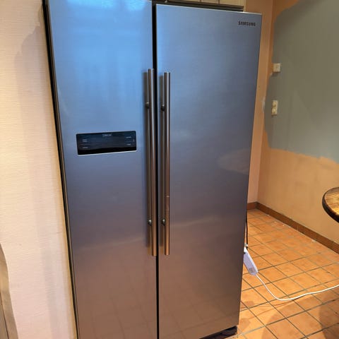Är utrustad med ismaskin samt man kan ta kallt vatten att dricka ( allt styrs från vattenbehållare i kylen)
