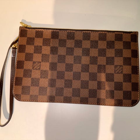 Louis Vuitton handväska för kvinna i läder. Väskan har ett rutmönstrat yttertyg i bruna toner och rödrandigt foder invändigt. En axelrem upptill gör att väskan kan bäras över axeln eller i handen. Väskan har öppen topp med möjlighet att stänga med rem och metallring. Passar för vardagsbruk med plats för plånbok, mobil, nycklar och andra personliga tillhörigheter.