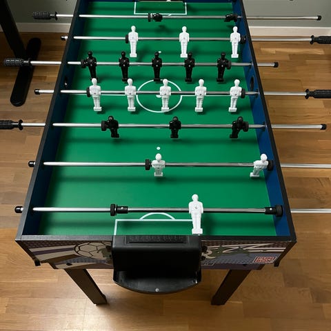 Bordspel som kombinerar shuffleboard och bordtennis. Spelplan i trä med tryckta poängzoner och färgad måltavla samt separat bordtennisskiva i grön plast med vitt nät. Levereras med tillbehör som puckar/brickor och fästen enligt bild. Lämpligt som kompakt spel för bord eller bänk i hemmet eller fritidsrum.