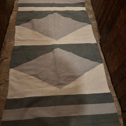 Den har en ”tvättad look” men har en liten upprepning på undersidan kanten som inte syns ovanifrån (se bild). 200cm x 80cm. Grå/vit