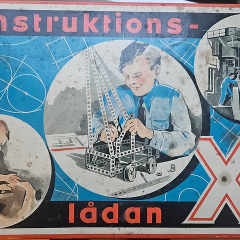 Meccano byggsats i grå plastväska. Väskan innehåller sorterade metalldelar, skruvar, muttrar, hjul och andra komponenter för montering av olika modeller. På insidan av locket finns en manual/bygginstruktion. Alla delar ligger i fack i väskan för enkel översikt och förvaring. Passar som konstruktionsleksak för barn och vuxna som vill bygga mekaniska modeller.