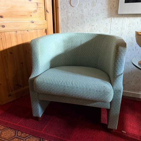 Fåtölj med rundad form och leopardmönstrad klädsel i tyg. Modellen har låg rygg och medföljande kudde i samma mönster. Passar som sittplats i vardagsrum, sovrum eller läshörna.