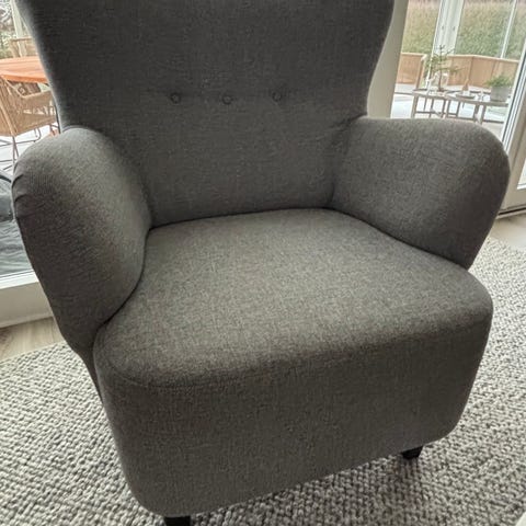 Rejäl äldre fåtölj i ljusblått tyg. Tyget har blivit lite smutsigt av långvarig användning.