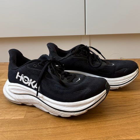Hoka Clifton 10 träningsskor i storlek EU 47, innerlängd 30,5cm. Skorna är svarta med vit mellansula och har snörning framtill. Ovandelen är i ventilerande textil/mesh med förstärkningar för stabilitet. Modellen är avsedd för träning och löpning och är utformad som herrskor. Yttersulan har mönster för grepp på olika underlag och mellansulan är kraftigt dämpad för komfort vid längre pass.