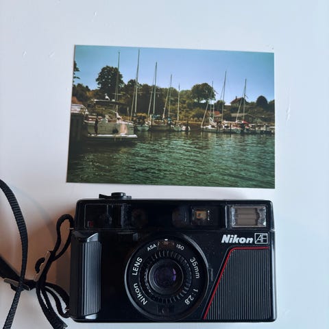 Vintage Canon AF35M (även kallad Autoboy / Sure Shot) i svart – en klassisk 80-tals kompaktkamera med skarpt 38mm f/2.8 Canon-lins, autofokus, autoexponering och inbyggd blixt. Denna är märkt med Vivitar (OEM-version) och har originalrem. Kameran tar emot batteri (testat, ström på) och ser ut att fungera mekaniskt, men filmbacksluckan går inte att öppna (låst/defekt lås eller plastbrytage – vanligt problem på åldrande plastkameror). Perfekt som reservdelskamera, för reparation, DIY-projekt, samling eller som snygg rekvisita/retro-deko. Linsen ren utan synliga repor/svamp, vyfinder OK. Se bilder