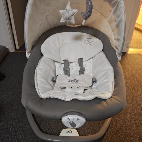 Jollyroom matstol för barn i grå färg. Stolen har en vadderad sits med sele och mjuk huvudkudde för små barn. Den är monterad på en stabil vit stomme och har en båge ovanför sitsen där leksaker kan hängas. Ryggstödet kan lutas bakåt för mer viloläge. Passar för matstunder och vila för spädbarn och småbarn, beroende på barnets vikt och ålder enligt tillverkarens rekommendationer.