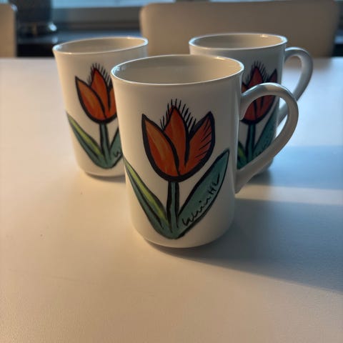 Två vackra muggar med tulpanmotiv av Ulrika Hydman