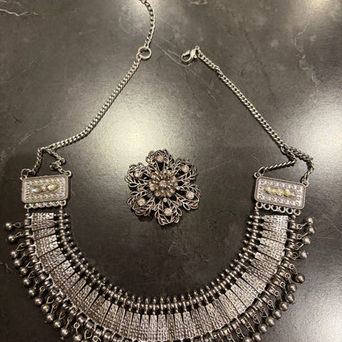 Halsband med hängsmycke i silverfärg och klara droppformade stenar
