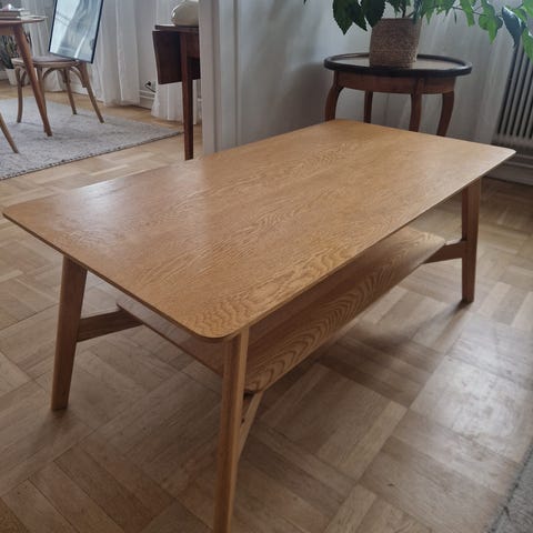 Ett soffbord som kan höjas samt förlängas . Har en inbyggd inläggsskiva som kan förlängas med 37cm . Glasskiva 6mm ingår , glasskiva är lika är måttbeställd till bordet. OBS ! Jätte stabil bord vinglar inte !!