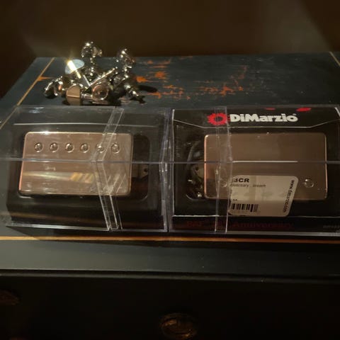 DiMarzio F-spaced gitarrtillbehör i form av humbucker-mickar i cremefärg. Passar elgitarr med F-spaced-stall, exempelvis gitarrer med tremolosystem där strängavståndet är bredare. Levereras i originalförpackning enligt bild. Lämpliga för montering eller uppgradering av elgitarrens pickupsystem.