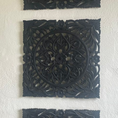 Fyrkantig massiv väggdekoration 120cmx120cm, i mörkbrun/svart med detaljerat ornamentmönster.