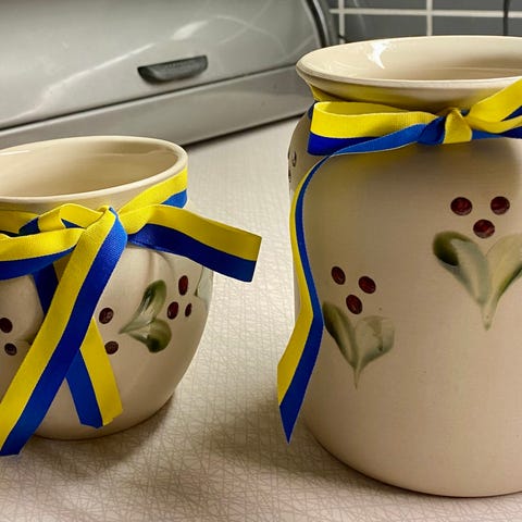 Beskrivning: Blommorna på den keramiska burken är konstnärliga tolkningar snarare än botaniskt exakta avbildningar av en specifik art.