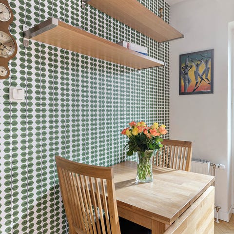 Matbord i massiv ek från Mio möbler samt fem stolar (Lillånäs) från IKEA. Nypris stolar: 995 kr/st.