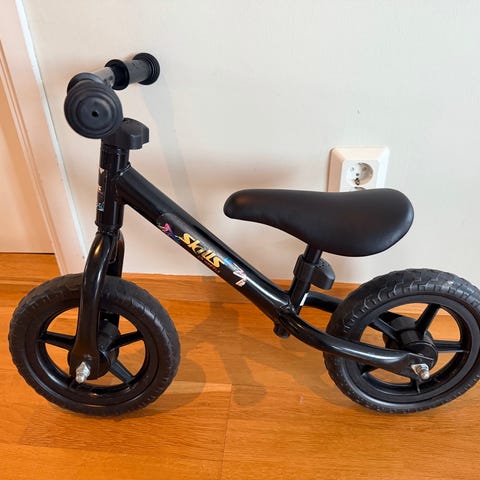 Balanscykel för barn med 10" hjul. Cykeln har rosa ram, ljusa plastfälgar och svarta däck. Utrustad med svart sadel och svarta handtag. Lämplig som första cykel för att öva balans och koordination innan trampcykel.