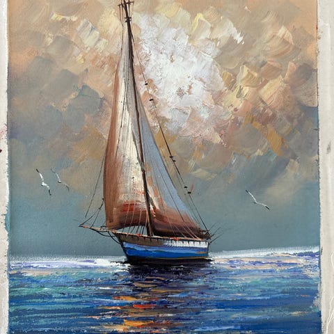 Tavla föreställande ett segelfartyg på havet i solnedgång. Motivet visar ett skepp med segel lutande mot vattenytan, med himmel och moln i varma färger samt reflektioner i vattnet. Flera fåglar syns i bakgrunden.