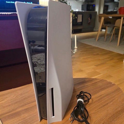 Sony Playstation 5 spelkonsol i vit färg. Konsolen på bilden visas tillsammans med en handkontroll och kablar. Lämplig för spel, streaming och underhållning. Standardutrustning för Playstation 5 med trådlös handkontroll och anslutningskabel enligt bild.