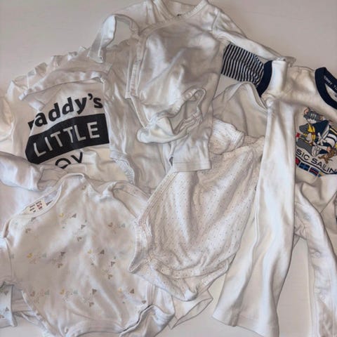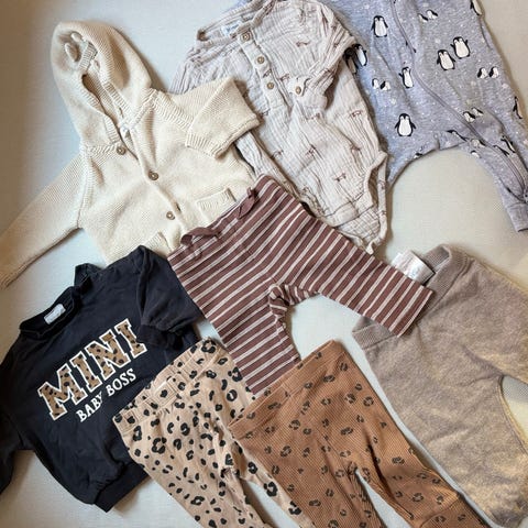 Klädpaket i storlek 62. På etiketten på det beiga setet står det storlek 56, men jag upplever att det motsvarar storlek 62.