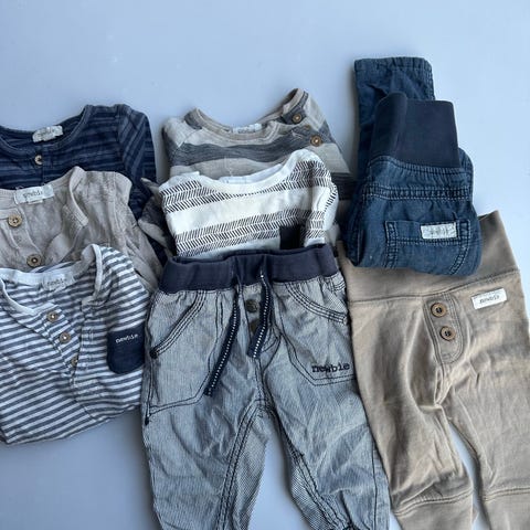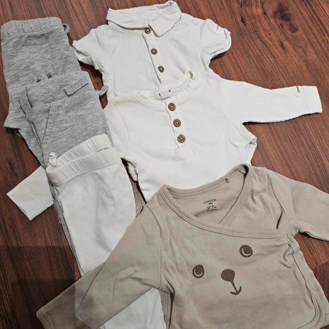 Babykläder för flicka i storlek 62. Flerfärgad blandning av plagg, bland annat bodies, tröjor, klänningar och shorts/bloomers. Från bl.a. Newbie, H&M etc. Mjuka material som passar spädbarn. Flera olika färger och mönster, exempelvis rosa, beige, grönt och blommigt. Lämpligt som basgarderob för baby i storlek 62.