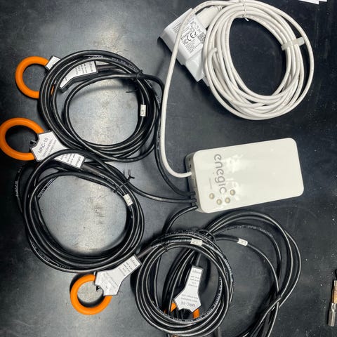 Myenergi harvi energimätare med tillhörande strömsensorer. Enheten används för trådlös mätning och överföring av energiförbrukning från elinstallationer, exempelvis i kombination med andra produkter från Myenergi. Strömsensorerna kopplas runt kablar för att registrera strömflödet och skicka data till systemet för övervakning och styrning av energianvändning.
