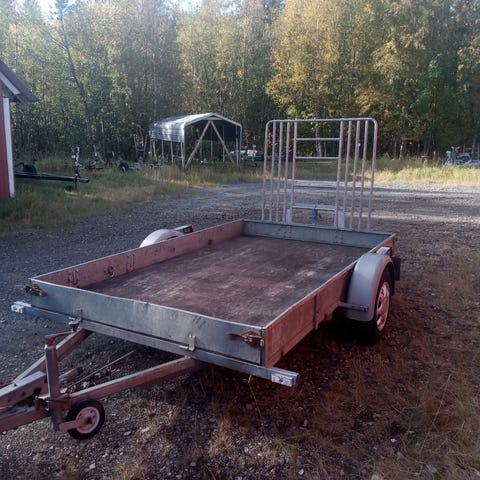 Norrlandsvagn med dieselvärmare, kylskåp, batteri och solcell. Påbyggt plåttak bra däck, traktor drag och 50mm kula. Säng, matbord och gasolkök.