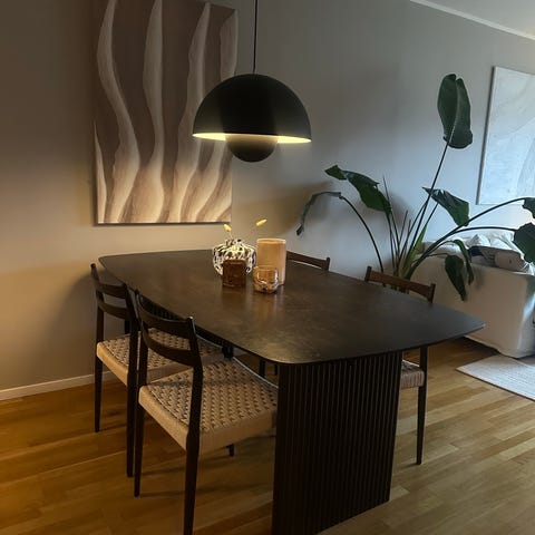 6 bekväma och bevarade matstolar utan några skador, väldigt bra skick, har behandlats med skydd. Inköpta på Mio, modell Fanny. Materialet är svart konstläder med ben i svartlackerad metall.