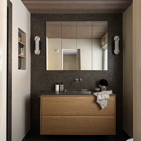 Badrumskommod med förvaring i körsbärsfanér och blandare från Dornbracht!