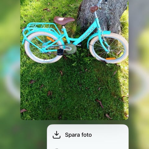 Barncykel med 20" hjul i blå färg med gröna skärmar. Utrustad med stödhjul, kedjeskydd och fotbroms. Passar barn som växer ur mindre cyklar och behöver en cykel i 20-tumsstorlek för vardagscykling och lek.