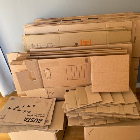Flyttkartonger i brun wellpapp. Kartongerna är hopvikta och staplade på varandra. Passar för packning och förvaring vid flytt eller magasinering av olika typer av hushållsartiklar och mindre föremål.